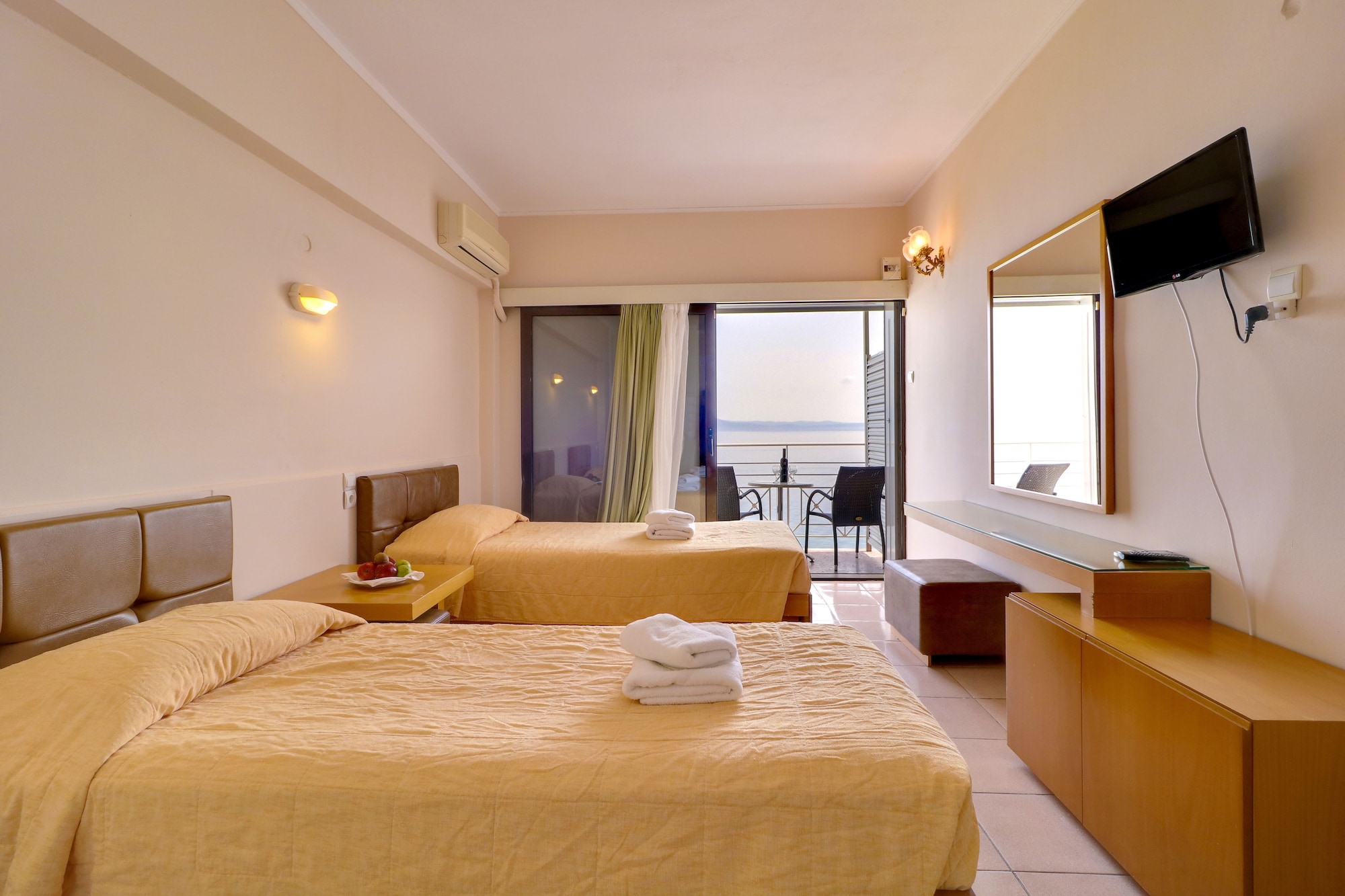 The 185 rooms at Calamos Beach Family Club Hotel offer air conditioning and sound-insulated walls for a comfortable stay. The bathrooms are equipped with showers and complimentary toiletries. Additional amenities include wardrobes/cupboards, fridges, and daily housekeeping.